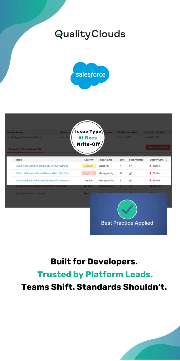 Quality Clouds for Salesforce integrates governance and best practices directly into the Salesforce development workflow. It offers real-time validation of code and configuration—catching errors during development and feature branch stages—to accelerate secure deployment and minimize technical debt.