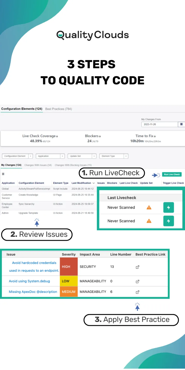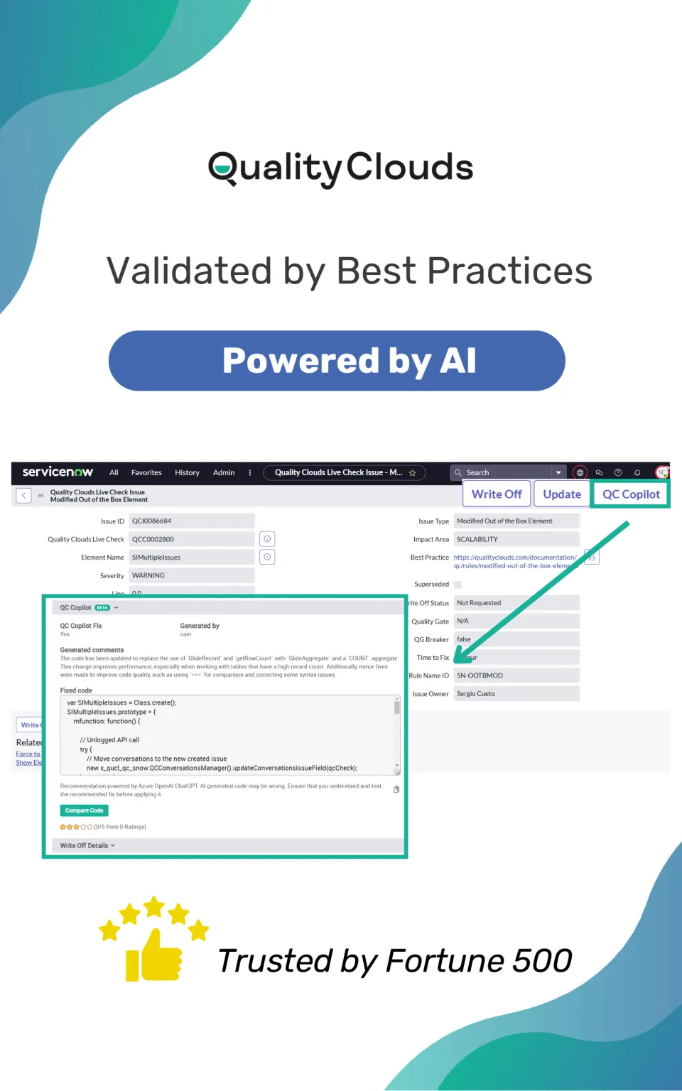 Overview Quality Clouds for ServiceNow is a cloud-based configuration analysis and governance tool designed to automate code review and platform health management for ServiceNow development. It enables organizations to enforce best practices, proactively identify security risks and technical debt, and integrate with CI/CD and DevOps pipelines to streamline deployments.