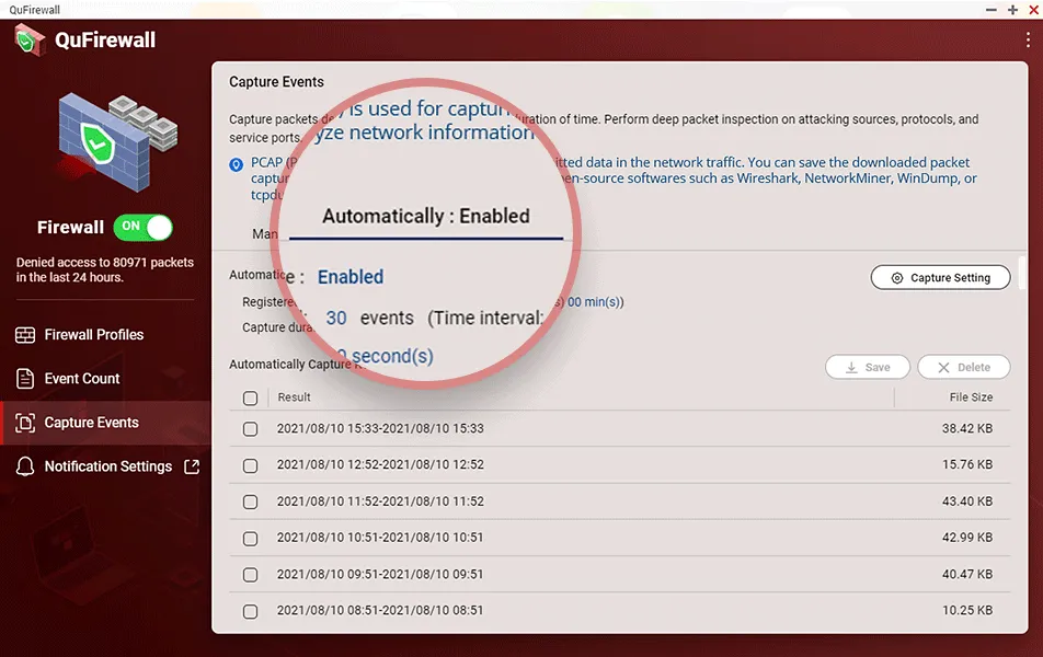 QuFirewall can record denied packets for a specific duration of time and perform deep packet inspection on attacking sources, protocols and service ports. It also provides PCAP (packet capture) files to enable further analysis to effectively mitigate malicious attacks.