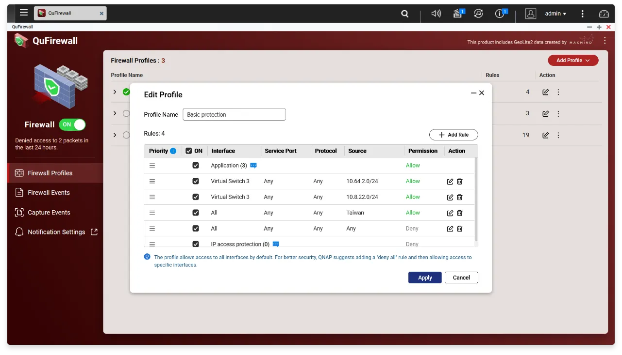 QuFirewall comes with three fully-customizable profiles for protecting your QNAP appliance. Select one as your starting point and make customizations to fit your specific needs.