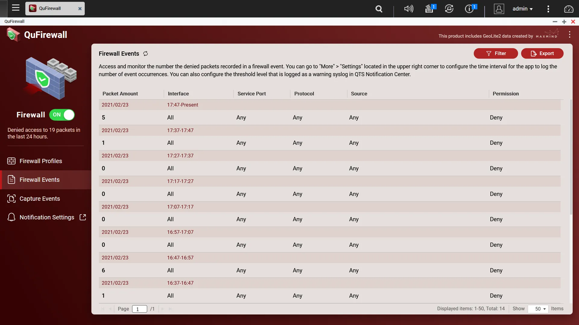 Quickly check the number of firewall events over time. If needed, you can also capture denied packets for a specified time period.