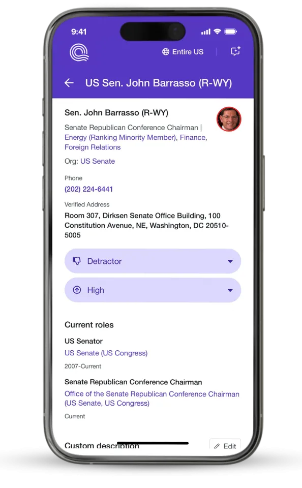 - Custom Contact Notes: Add and edit descriptions for officials and staffers to personalize outreach.