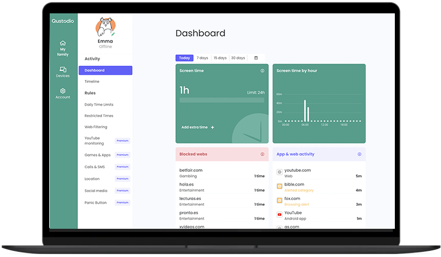 Qustodio is a cloud-based parental control and digital wellbeing solution designed to help parents and guardians supervise and manage children’s online activity across multiple devices. The platform provides tools for filtering web content, blocking inappropriate apps and websites, setting screen time limits, and monitoring device usage in real time. Qustodio supports a wide range of operating systems, including iOS, Android, Windows, Mac, Chromebook, and Amazon Fire, allowing parents to manage all their children’s devices from a single dashboard. The system offers detailed activity reports, real-time alerts, and location tracking, as well as features for monitoring calls and messages (on supported platforms). Qustodio is customizable to each family’s needs, with options for scheduling screen-free times, pausing the internet, and receiving SOS alerts. The platform is suitable for both home and school environments, supporting digital safety, healthy routines, and compliance with safeguarding best practices.