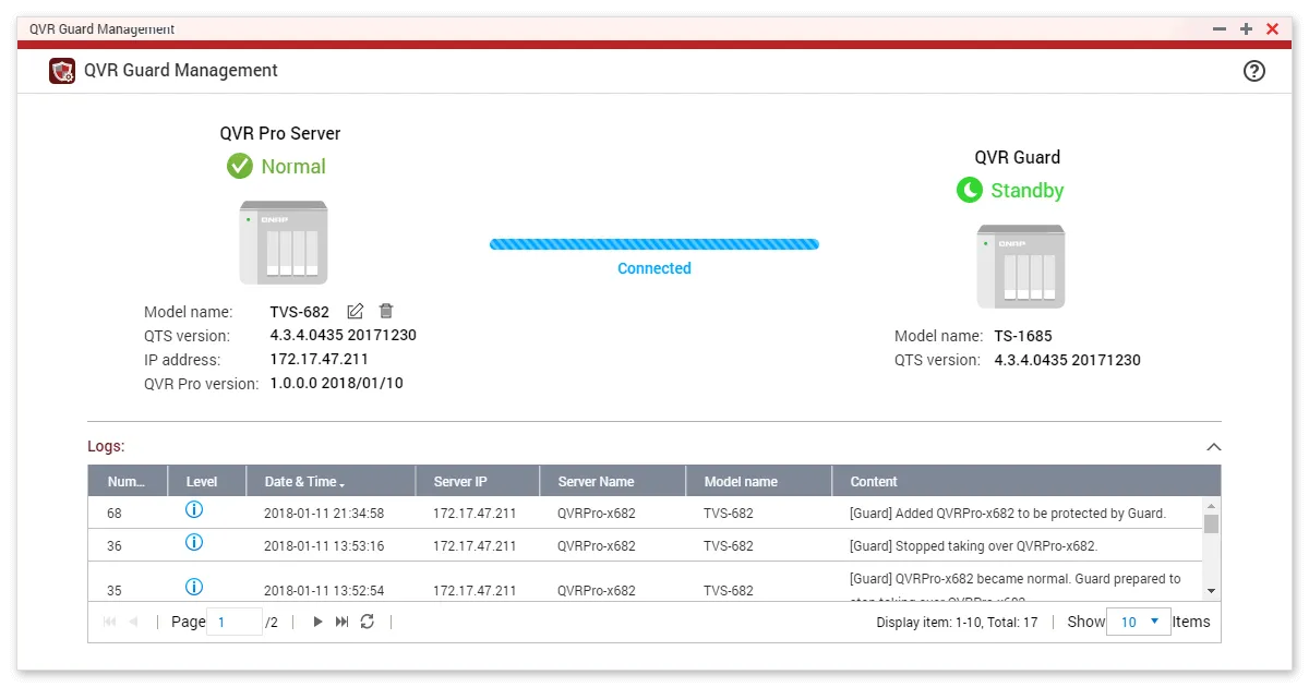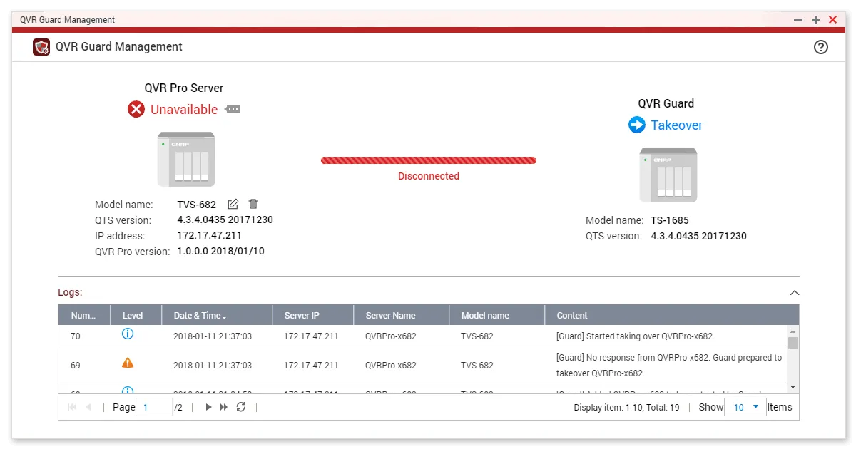 The QVR Guard toolbar shows the current work mode that reflects QVR Pro's operating status, and administrators can react to system alerts in real time. QVR Guard records the failover time and tasks in detail, allowing IT staff to address issues as soon as they arise.