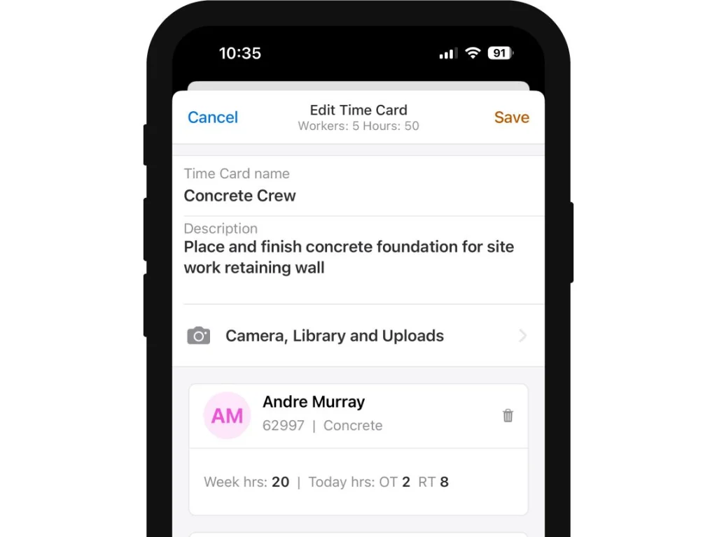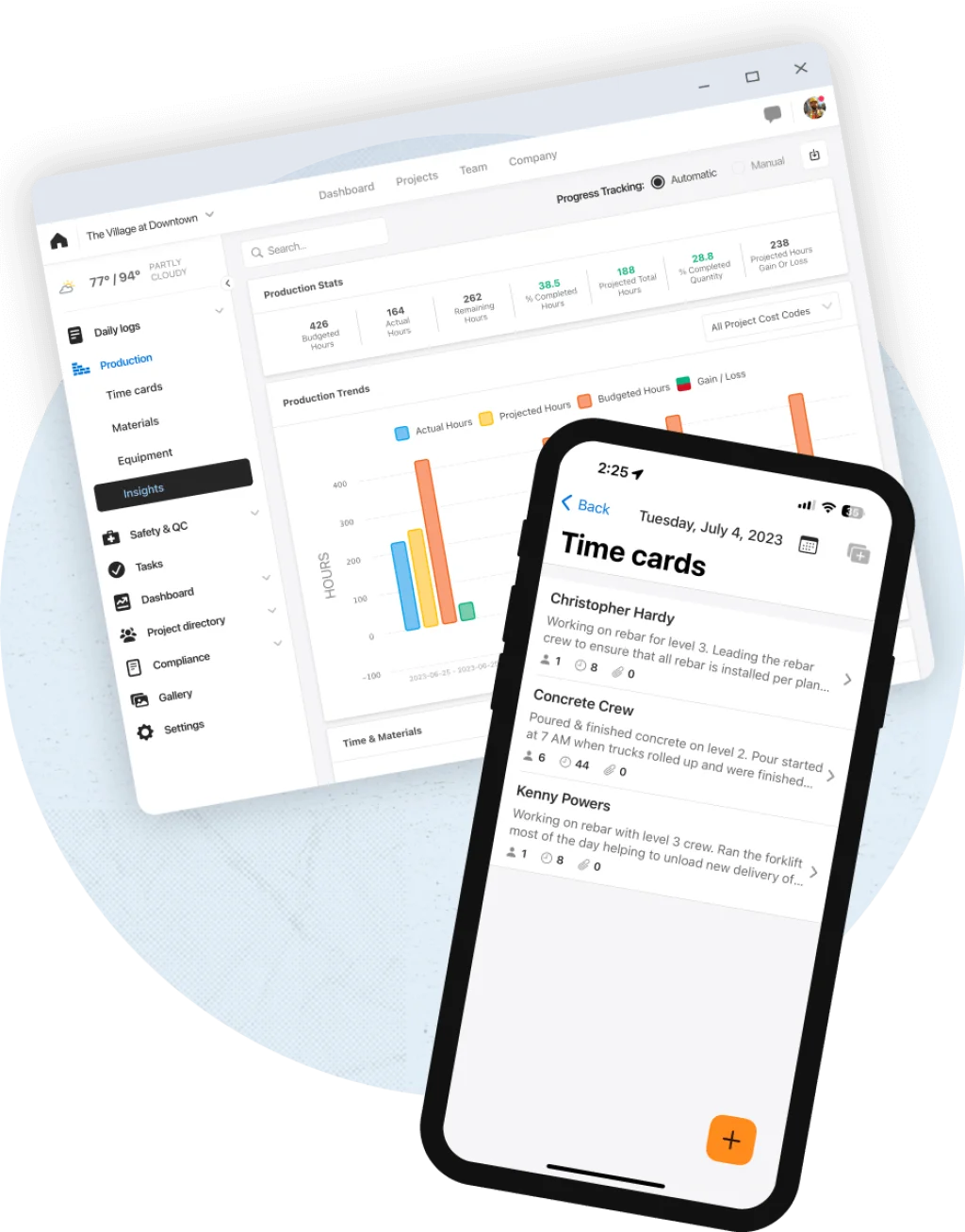- Time & Production Tracking: Offers flexible time logging and detailed tracking of material and equipment use, with organized dashboards for project performance insights.