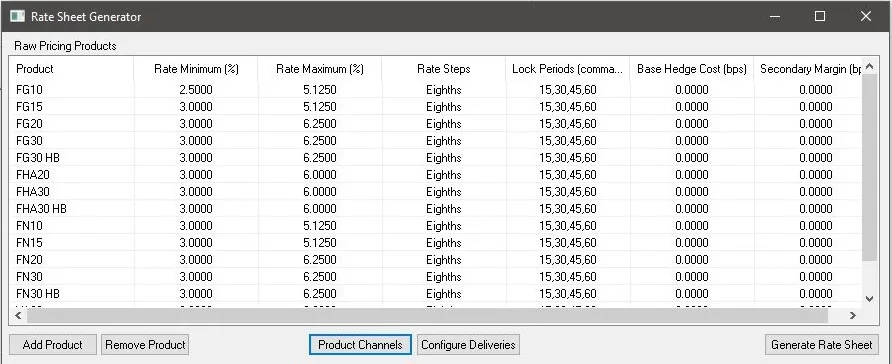 RateSheet Generator™ is a secondary market software solution designed to create data feeds for any Product and Pricing Engine. It allows users to integrate pricing from various sources, including MBS, cash window, mandatory executions, and flow servicing agreements. The software facilitates the creation of daily pricing directly tied to profit margins, with customization options based on origination channel. Users can define and track margins for corporate, secondary, and individual production units, as well as define hedge costs. It generates flat files for easy import into pricing engines and allows for customized templates to distribute rates. MIAC Analytics also offers related secondary market tools such as MarketShield®, BuySide Trader™, SellSide Trader™, and MOJO™ for pipeline hedging, bid formulation, best execution, and loan slotting automation.