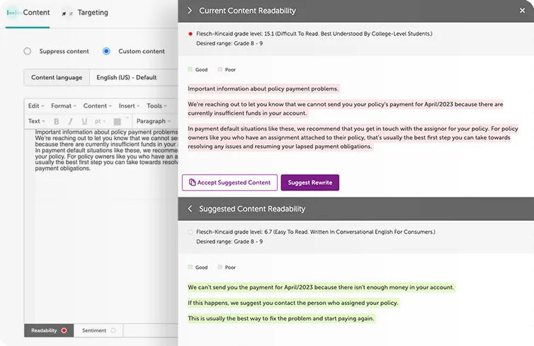 - Full Control & Transparency: Although AI provides rewrite suggestions, users maintain full control over final content, supported by detailed insights into brand compliance, sentiment, and readability.