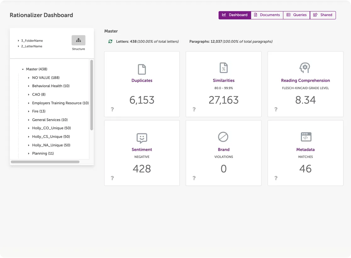 - Consolidation of Duplicates: Detects exact and similar content to consolidate and reduce the total number of content objects under management.