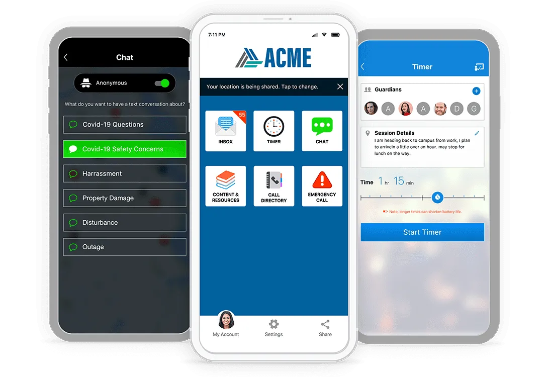 A custom-branded personal safety app for institutions to connect with and protect their communities via virtual escorts, confidential tips, and emergency alerts.