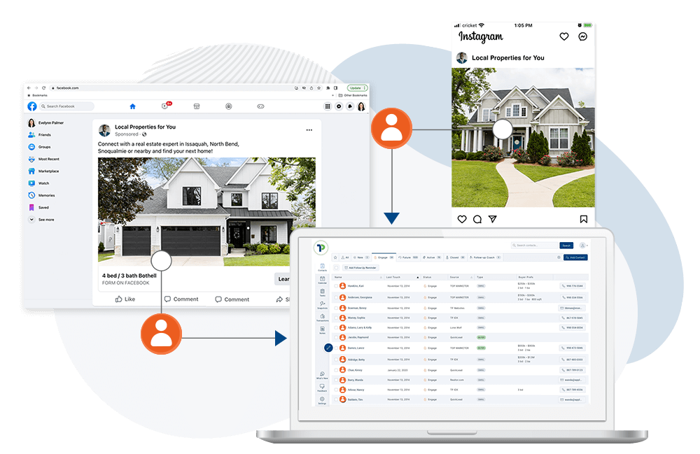 Grow your database with a steady stream of affordable, exclusive real estate leads from social media ads. Every month, you’ll connect with an average of 30 consumers interested in real estate in your local market for just $300/mo!