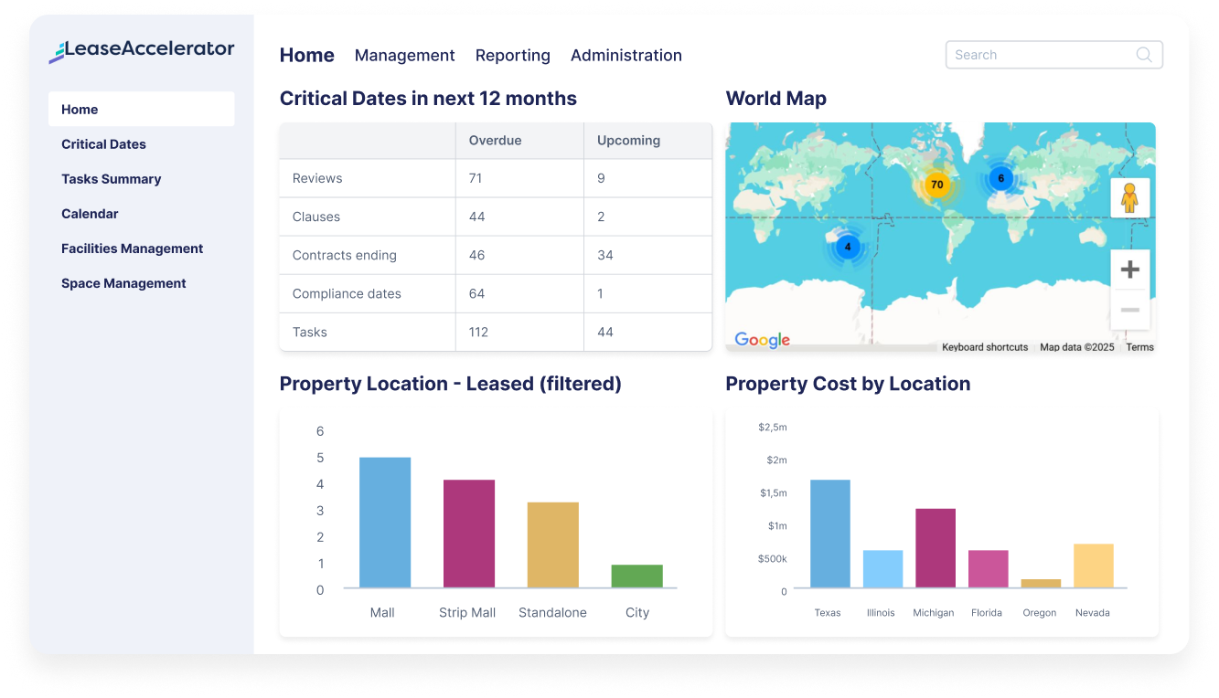 - Centralized Management: Consolidates scattered data from spreadsheets, emails, and various systems for a clear view of leases, expenses, and deadlines.