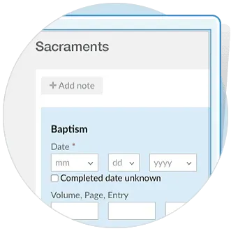 Celebrate important moments in someone’s life. Realm church profile management software offers both Catholic and Protestant preferences for tracking sacraments. You can edit your default sacrament list at any time and customize the information you want to record for each. You can also change the Sacraments tab label to match your church tradition.