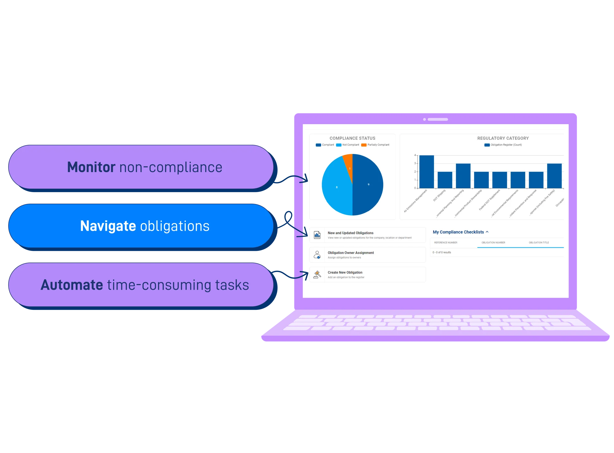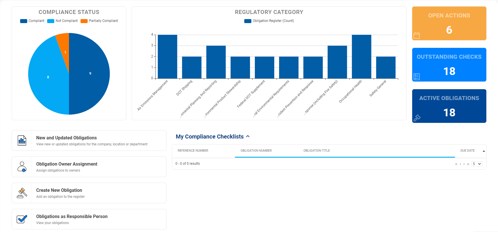 - Audit trail & evidence: Store evidence, maintain audit trails and versioned records for obligations and corrective actions to demonstrate regulatory performance.