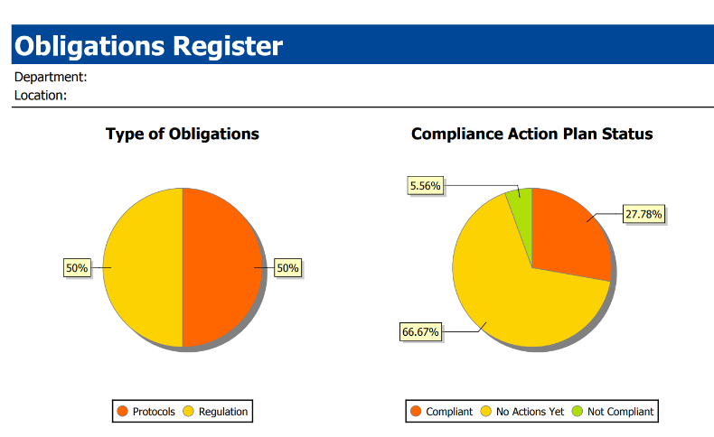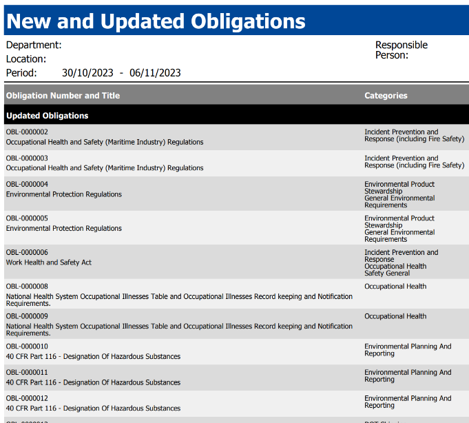 - Obligation management: Maintain a central obligations register with versioned history and metadata for each regulatory requirement; track changes over time and link obligations to locations, departments and owners.