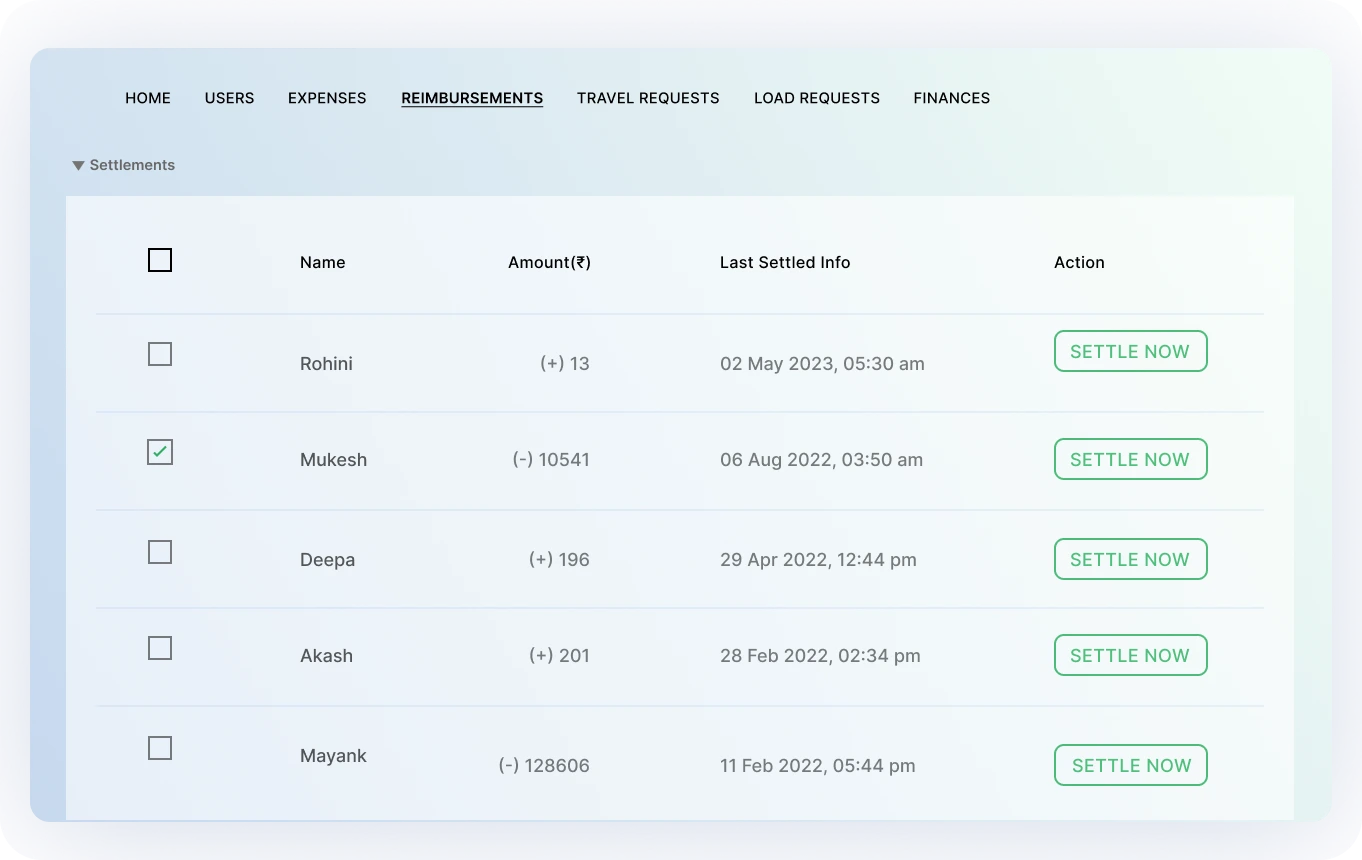 - Choose all policy-approved expenses and bulk settle the reimbursements – all in one click
