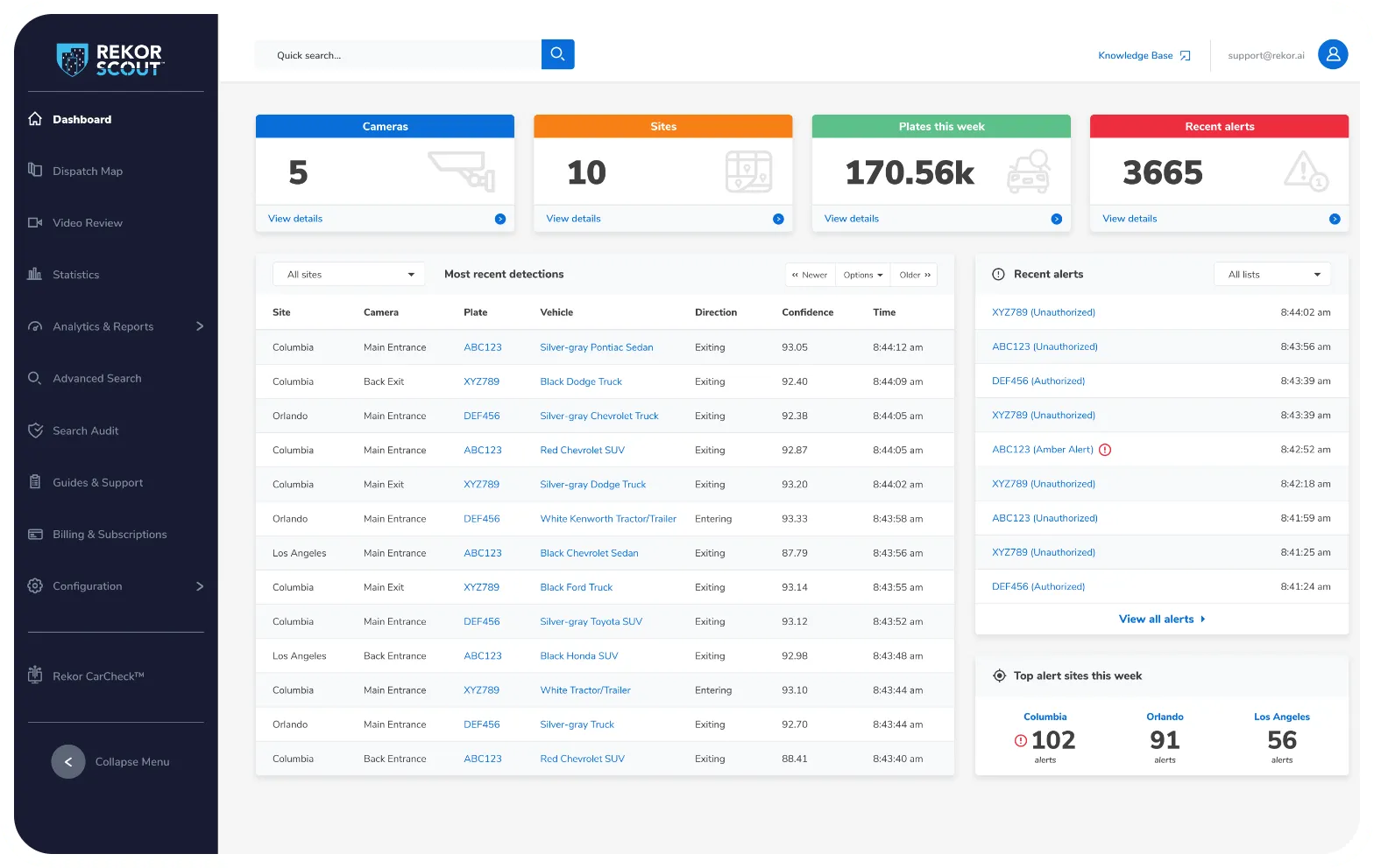 Rekor Scout® enables accurate license plate and vehicle recognition on nearly any IP, traffic, or security camera. Detection results are displayed within a web-based interface hosted in the cloud or on-premise. Installation is quick and easy, making it the perfect security enhancement for government agencies, law enforcement, businesses of all sizes, and even homeowners.