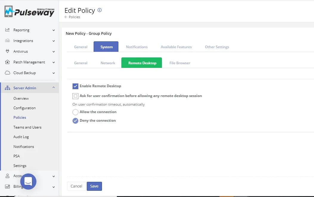 - Native Remote Control: Securely access and operate any device in your environment using Pulseway’s proprietary technology or Microsoft RDP.