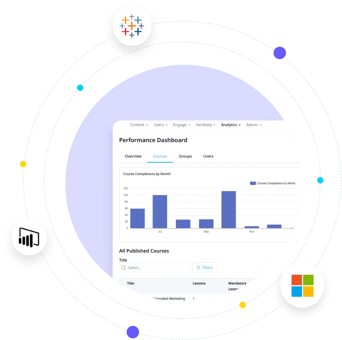 Go deeper with your data with built-in integrations Create powerful dashboards by integrating with tools like Power BI and Tableau. Or, easily pull key metrics from analytics so you can do even more with your learning data.