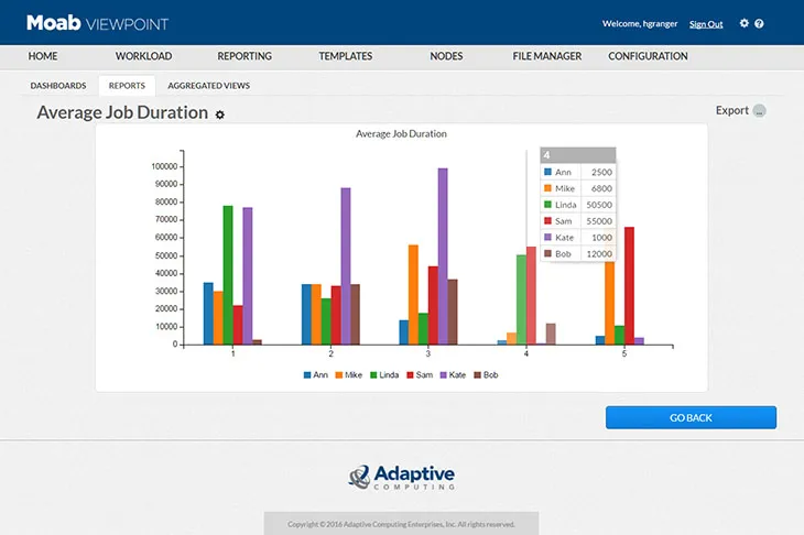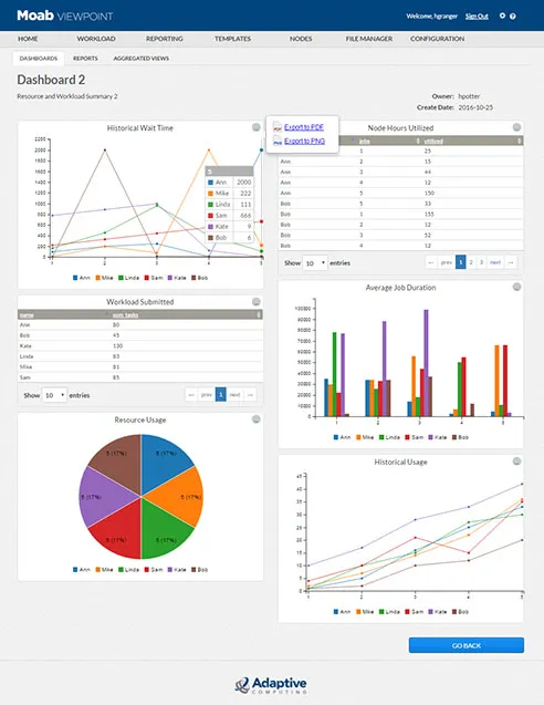 Reporting and Analytics by Adaptive Computing is a powerful tool that enables organizations to gain actionable insights by streaming resource usage and workload data into custom reports and dashboards. Integrated with the Viewpoint portal, it supports better decision-making, improved resource utilization, and enhanced capacity planning. The solution leverages Apache Spark and MongoDB for high performance and scalability.