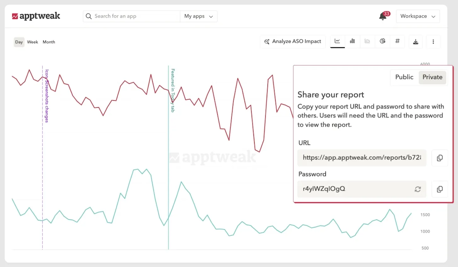 - Interactive Sharing: Share reports via secure links or password protection—even with users who don’t have an AppTweak account.