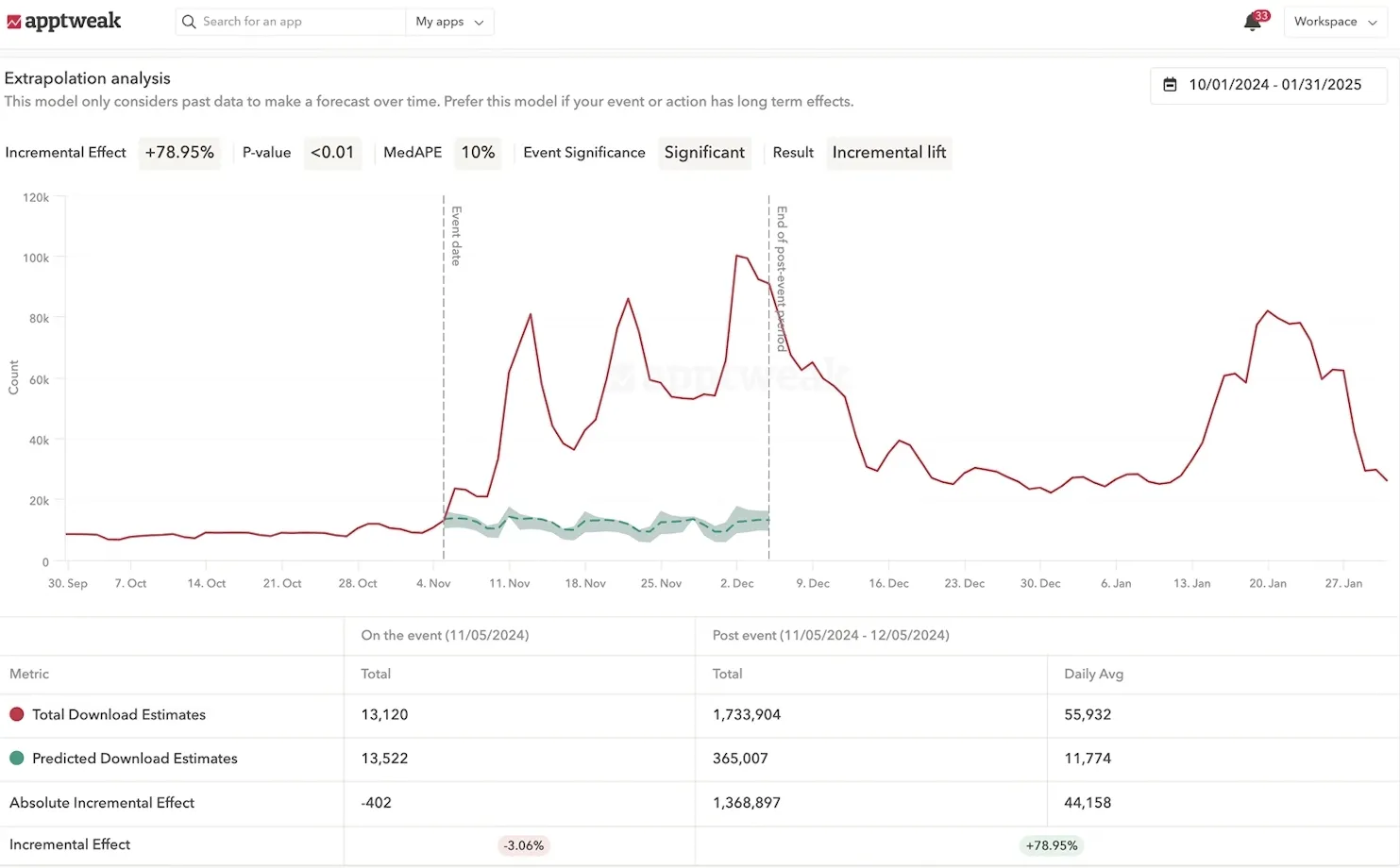- Incrementality Analysis: Use predictive modeling to compare actual results against forecasted baselines and measure the true impact of ASO, paid UA, and external campaigns.