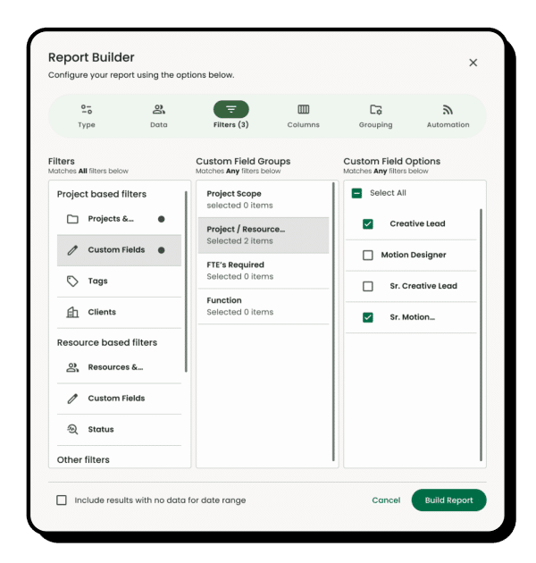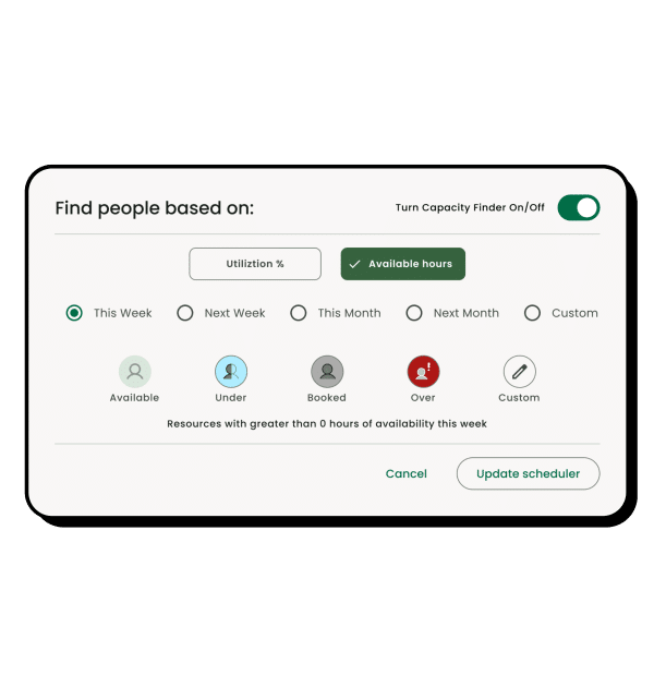 - Quickly find the right team members by filtering based on availability, skills, and utilization for optimal resource allocation.