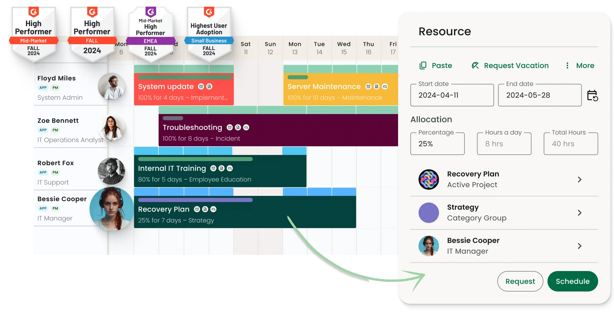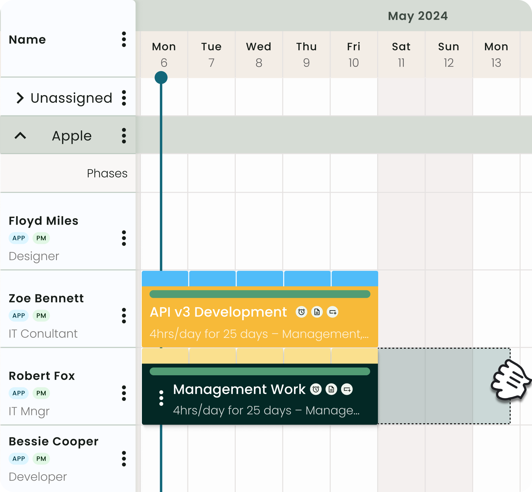 - Easily schedule and manage teams with an intuitive scheduler providing full visibility into availability, utilization, and project needs.