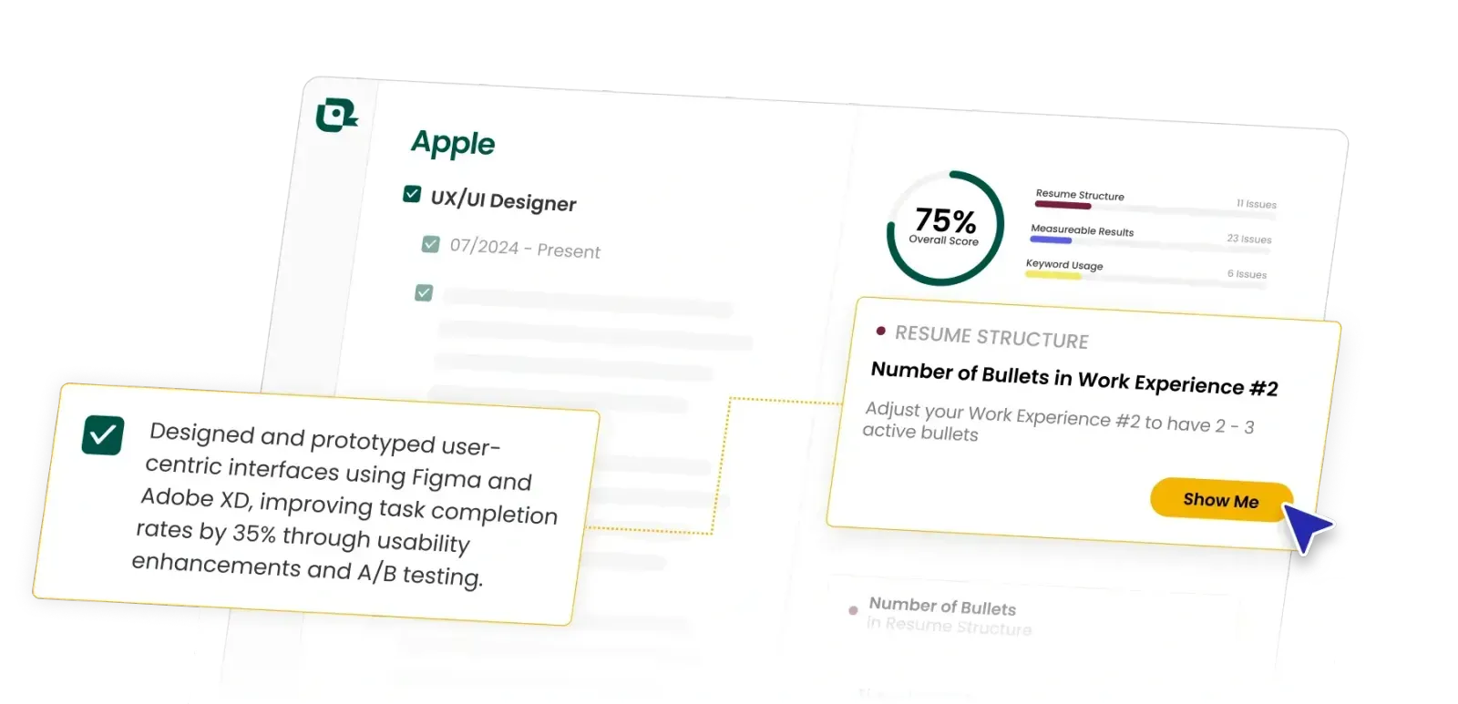 - Instant Resume Analysis: Get real-time feedback on formatting, keyword usage, and structure.