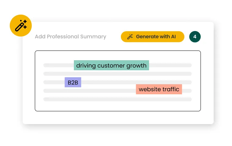 Start strong with a summary that gets noticed. With the free resume summary generator and our other resume tools, you’ll create tailored, job-matching summaries in seconds. Apply with confidence and get hired 58% faster.