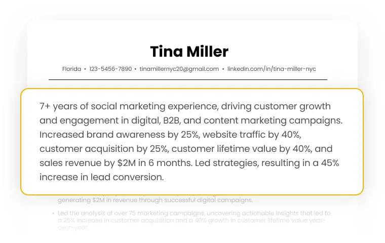 - **Customize your summary to the job—fast: **Every resume should be tailored to the unique job.. That includes the summary. Match your resume to a job, then generate a summary aligned to the role’s tone, keywords, and requirements so your value and alignment are clear from the very first line.