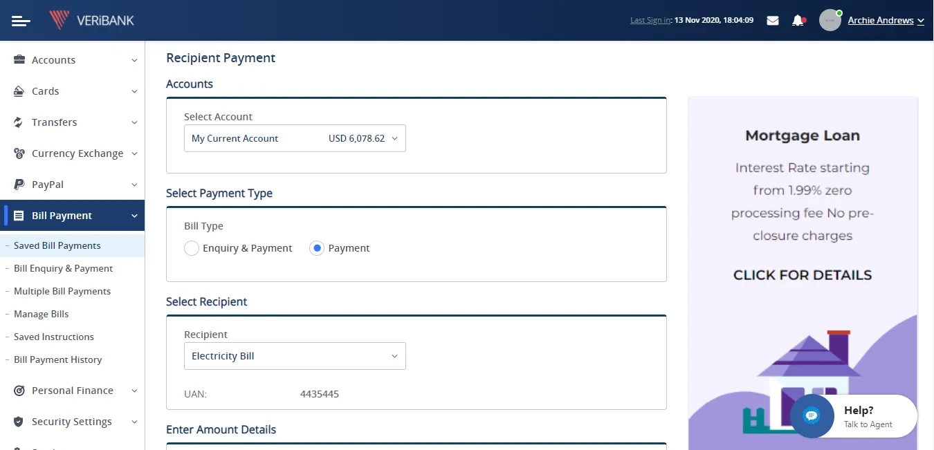 - Ability to make bill payments for different service providers.