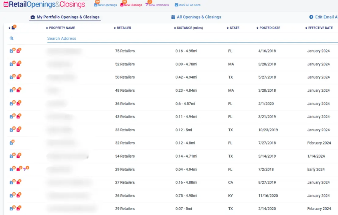 Retail Openings & Closings sends in-app notifications as well as email alerts based on distance and exposure around each users’ portfolio to keep them informed on the most impactful events within their shopping centers and retail markets.