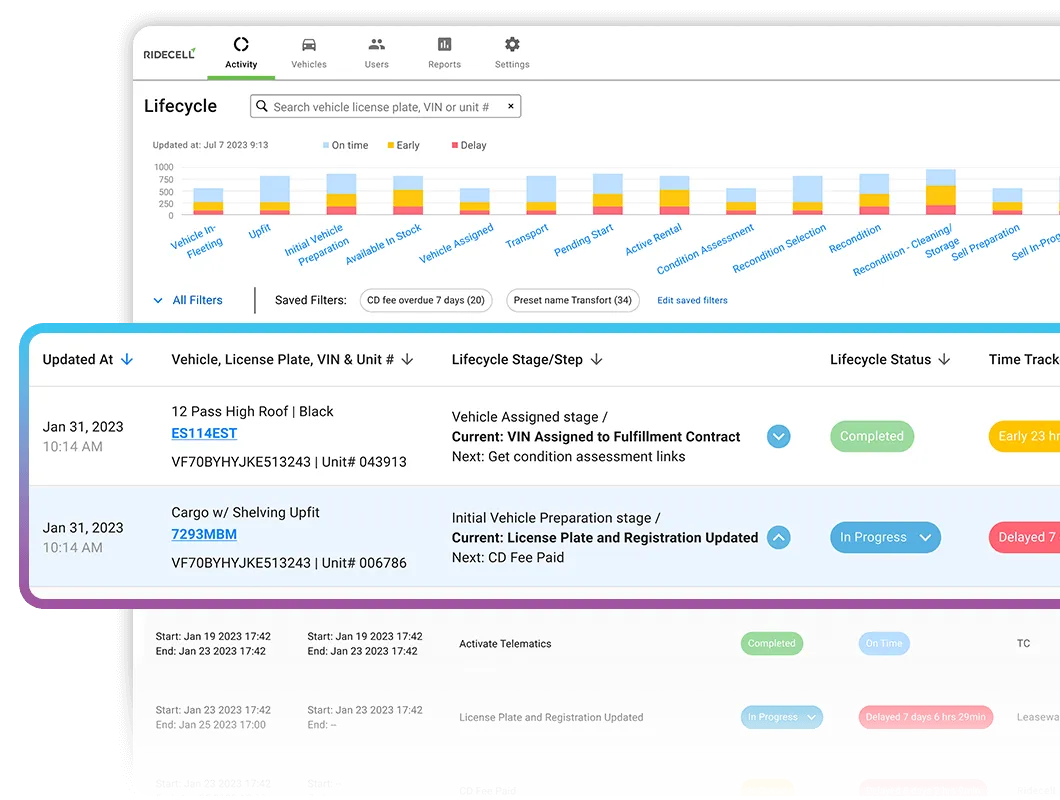Timely asset delivery and communication are critical to a high-quality customer experience. Today this process generates a high volume of calls and emails between employees, suppliers and customers to uncover and then communicate the source of a delay. Ridecell Orchestration helps resolves this by: