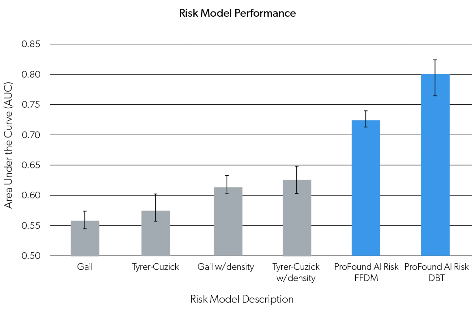 Our Risk solution* is different, offering up to 2.4x more accuracy than traditional risk models like Tyrer-Cuzick and Gail,1,2 and is personalized based on age and image evidence directly from their mammogram. It’s near-term providing a risk probability score for developing breast cancer in the next 1 or 2 years giving women and care providers more actionable information to design personalized care plans.