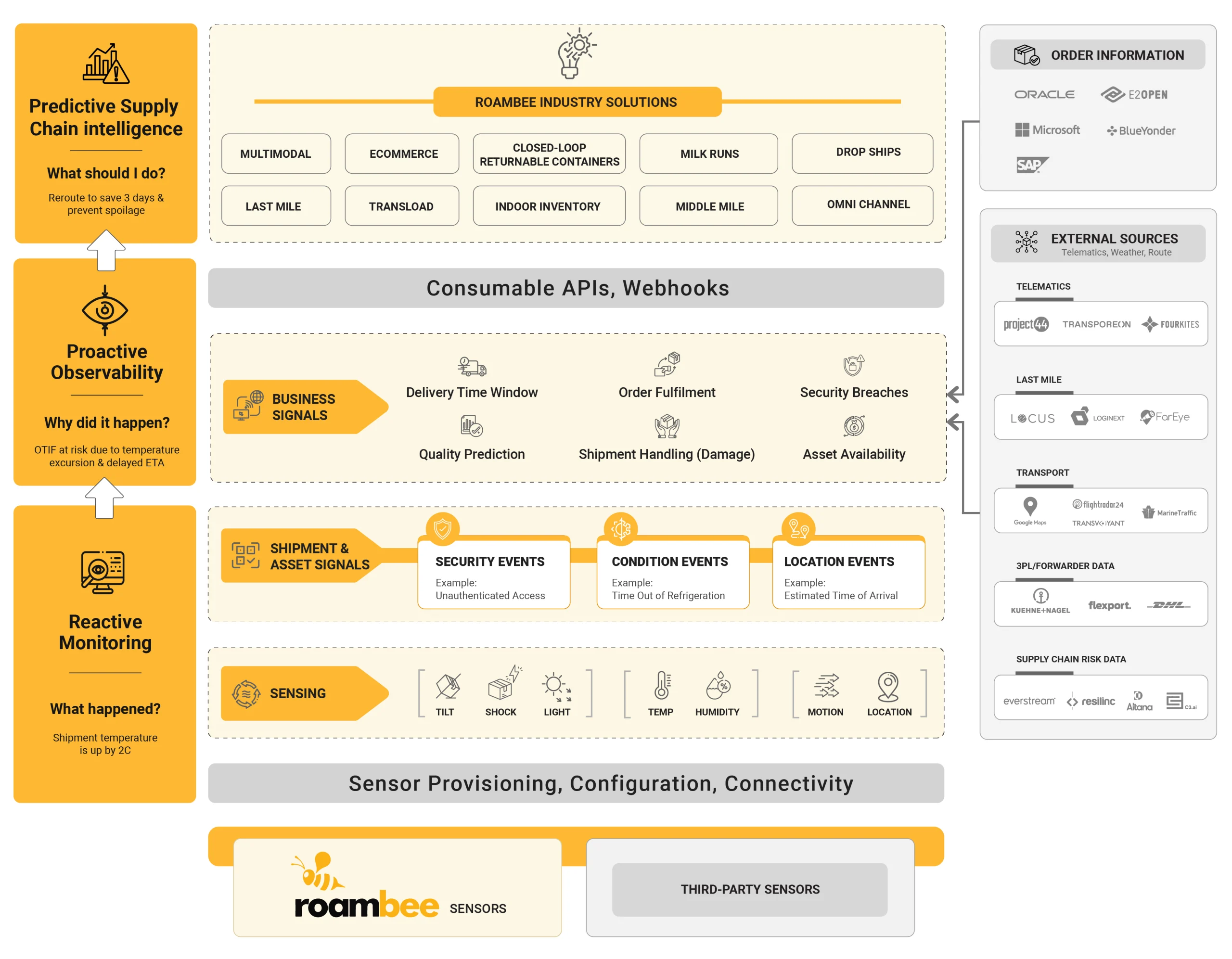 - Consolidates diverse data sources including carrier milestones, sensor data, last-mile visibility, order information, Scope 3 emissions, and potential supply chain risk triggers to generate intelligent business signals.