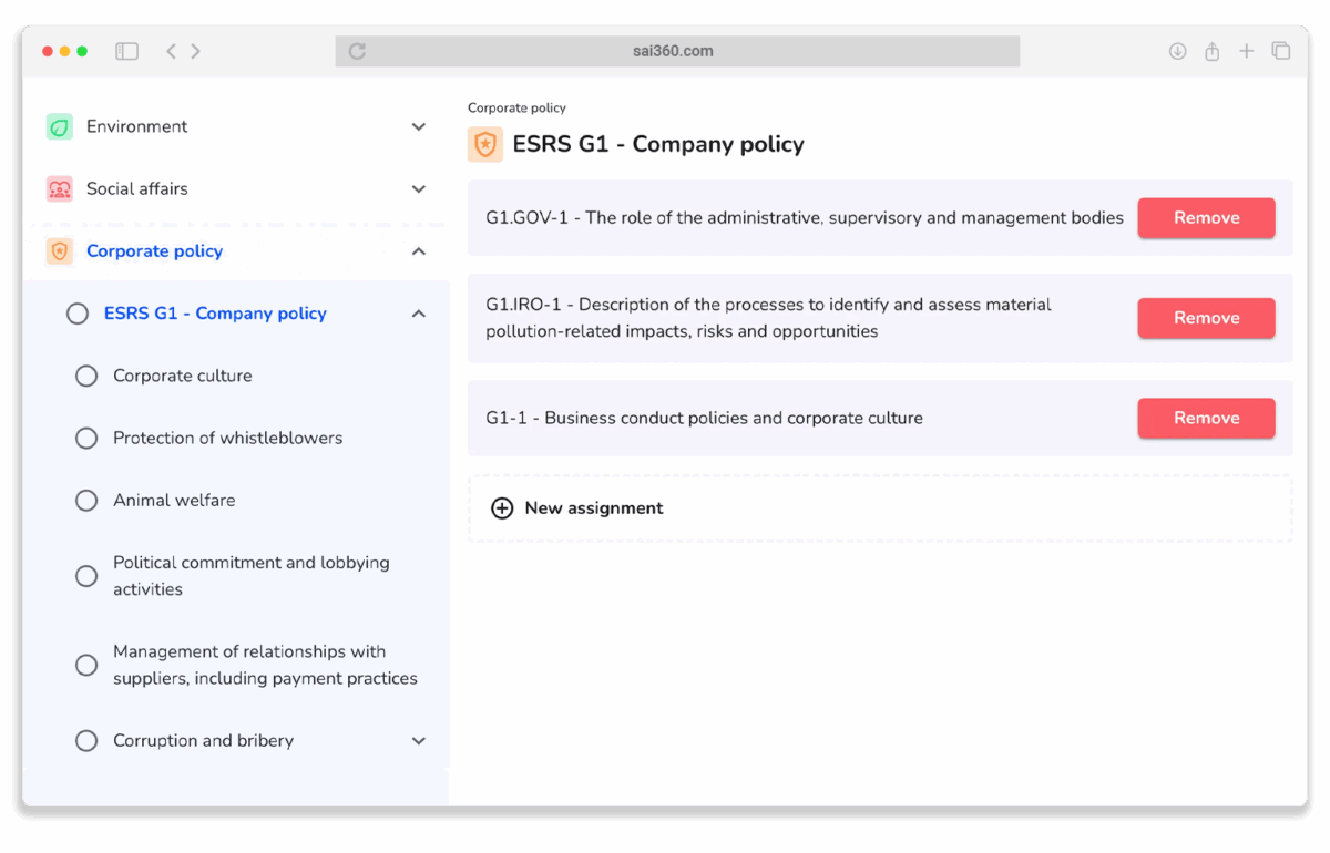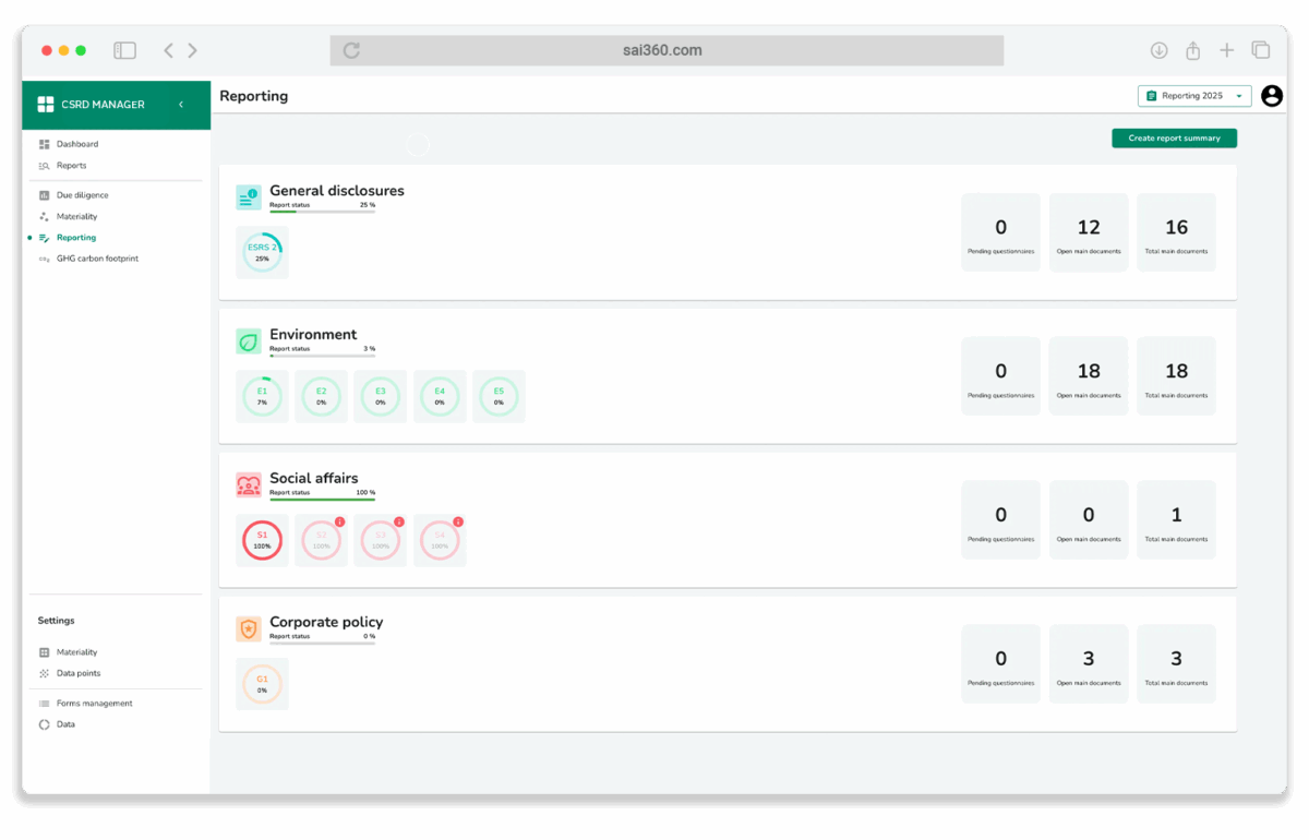 SAI360 CSRD Reporting is a cloud-based solution within the SAI360 platform designed to support organizations in meeting Corporate Sustainability Reporting Directive (CSRD) requirements. It enables structured ESG data collection, double materiality assessments, documentation management, and reporting aligned with European Sustainability Reporting Standards (ESRS). The solution integrates sustainability, risk, and compliance data within a centralized governance framework to support transparency and audit readiness.