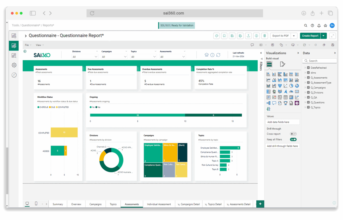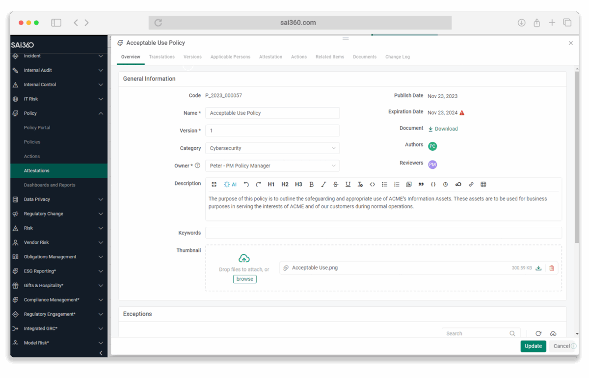 The SAI360 Platform is an integrated governance, risk, and compliance (GRC) system designed to centralize and manage organizational risk, regulatory compliance, ethics, audit, and learning processes. It provides a unified environment that enables enterprises to structure, monitor, and report on risk and compliance activities across business units. The platform consolidates multiple risk domains into a connected framework, allowing organizations to align policies, controls, assessments, incidents, and audits within a single system. It supports structured workflows, role-based access, and configurable reporting to ensure oversight and accountability. SAI360 is delivered as a cloud-based enterprise solution and is designed to integrate with existing business systems. It enables organizations to manage regulatory obligations, operational risks, third-party exposure, and internal governance processes in a coordinated manner. The system emphasizes traceability, documentation, and real-time visibility into compliance posture and risk exposure while supporting audit readiness and regulatory reporting requirements.