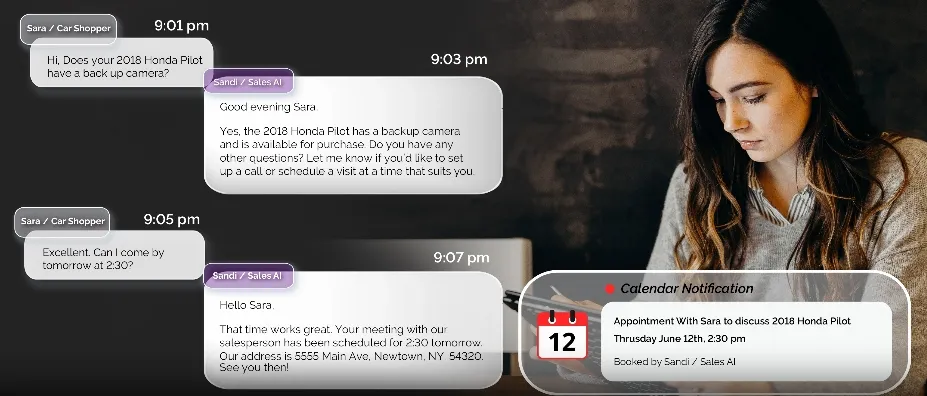 Sales AI is Impel’s generative conversational AI platform designed to deliver hyper-personalized, humanlike conversations that convert more customers and enhance dealership productivity. Built specifically for the automotive industry, Sales AI uses a proprietary blend of large language models (LLMs), Natural Language Processing (NLP), and Machine Learning (ML) to engage every internet lead instantly—via email or text—24/7, including full after-hours coverage. This platform doesn’t just automate responses; it creates natural, empathetic dialogue that builds trust and guides customers toward showroom appointments or live calls with sales or BDC teams. The conversations are so realistic that customers often ask to speak with the AI assistant by name.