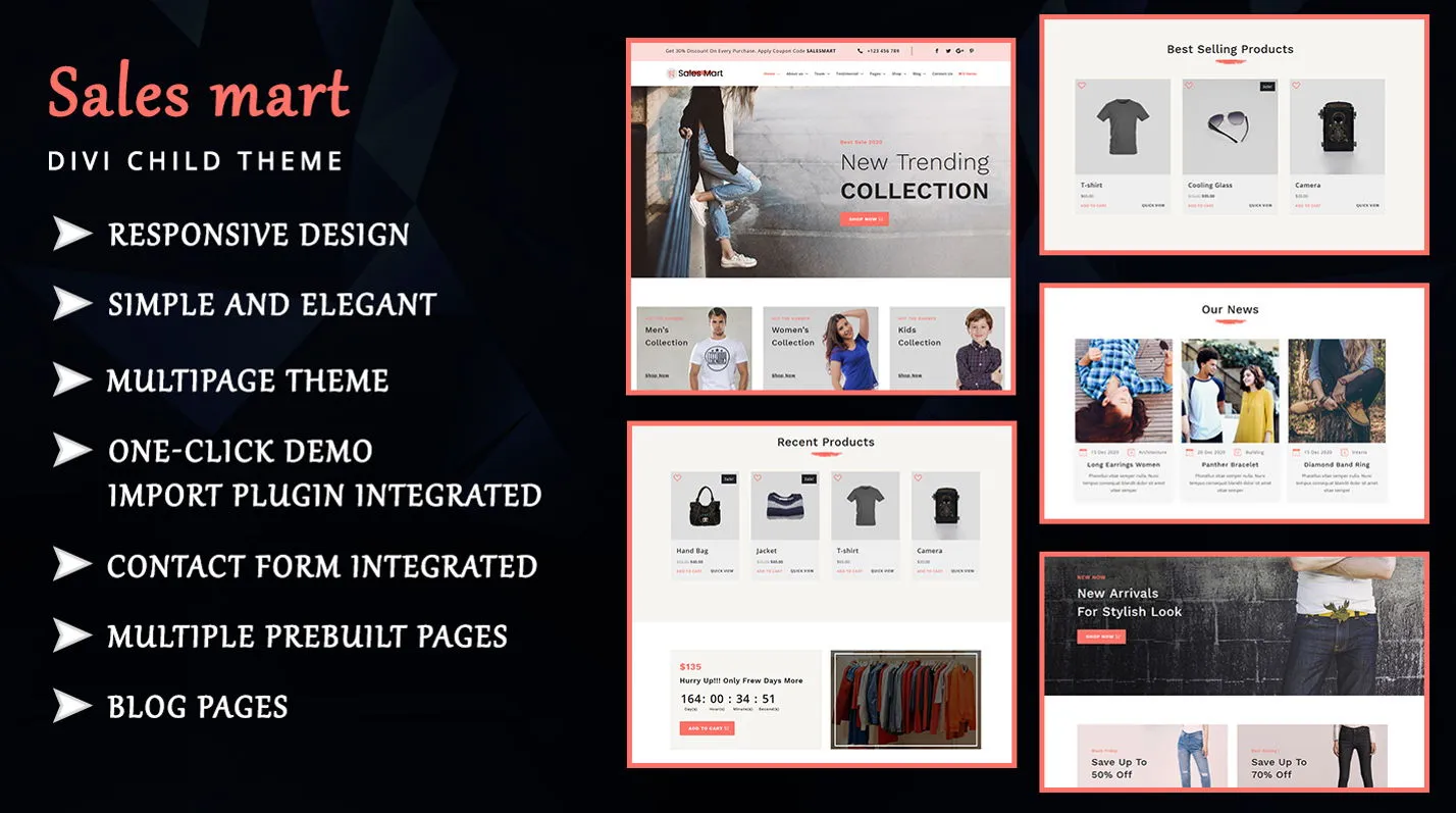 Sales Mart is modern and elegant Multi Page Divi Child Theme which is suitable for shopping, fashion, life style, sales, e-commerce, Black Friday, Christmas, Cyber Monday, Thanks Giving day, New year, offers and discount categories.