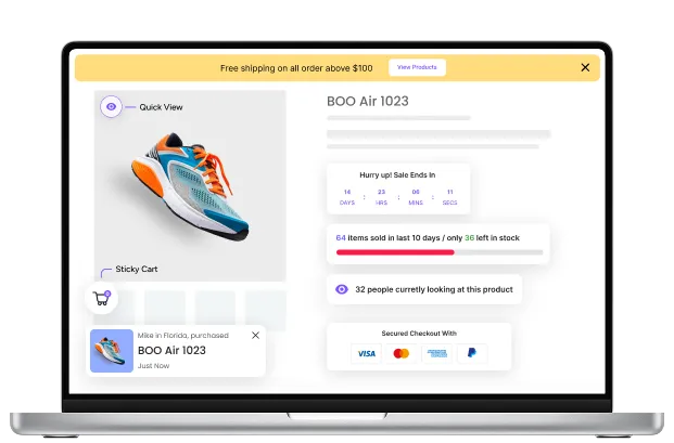 Boost conversions with real-time sales popups, urgency triggers, and social proof to drive instant buyer action.