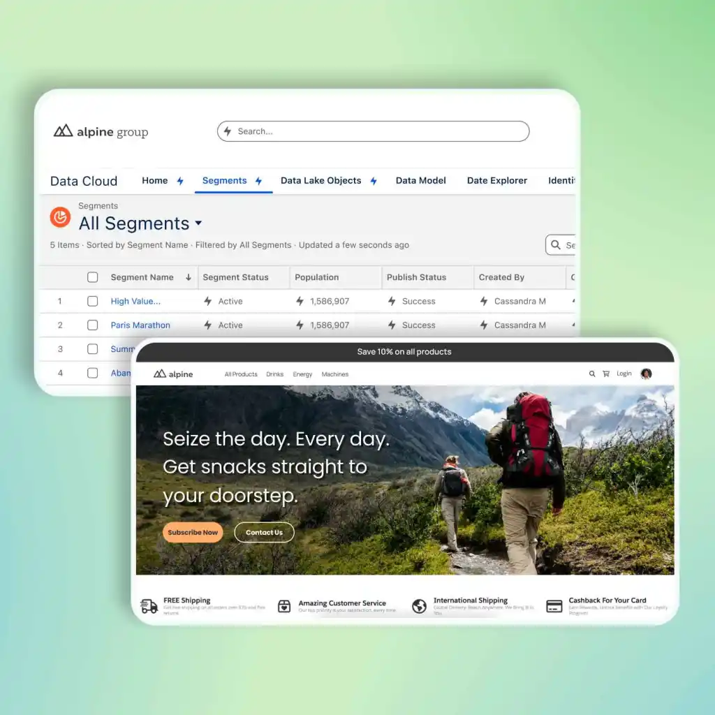 Data Cloud Segments help you deliver high-value, cross-channel experiences to pre-defined customer segments enhanced with commerce data. By bringing in data from in-store, third-party online sources, reviews, and unified profiles, you can build common journeys across Marketing Cloud, Commerce Cloud, and Service Cloud.