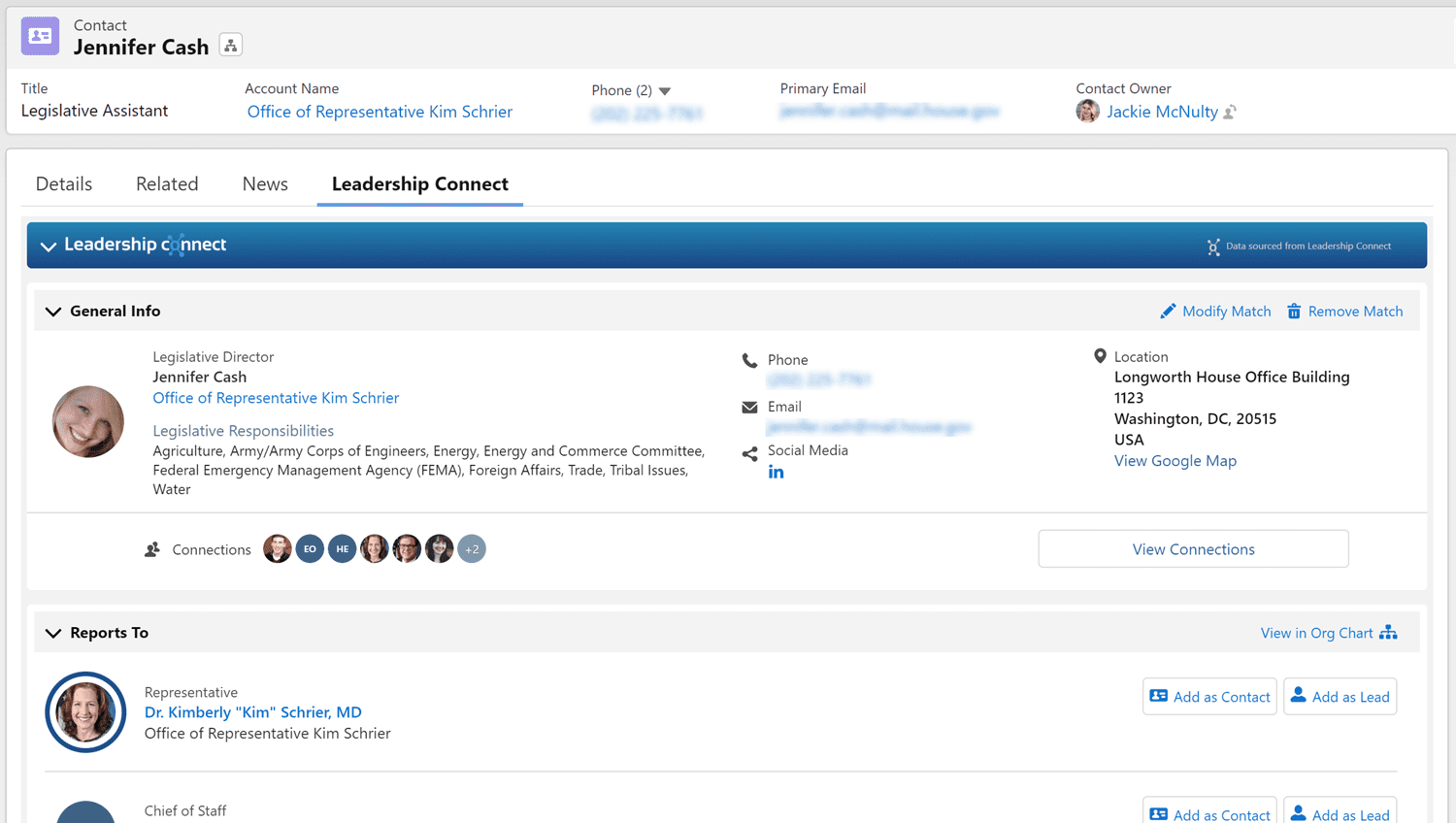 Salesforce Integration by Leadership Connect is a cloud-based integration service that connects Leadership Connect intelligence data with Salesforce CRM environments. It enables users to synchronize leadership profiles, organizational records, and related intelligence into Salesforce objects. The integration supports structured data transfer, helping teams maintain consistent and up-to-date contact and account information within their CRM. It is designed for organizations that manage stakeholder engagement, government relations, public affairs, or business development activities within Salesforce.