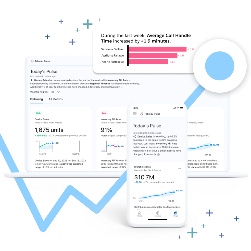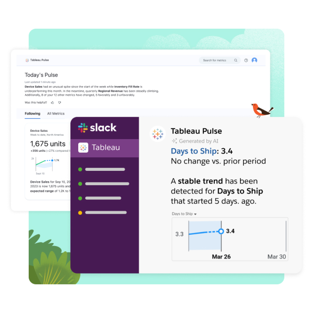 Right time, right place: Make insights actionable by bringing them into where you’re already working. Whether Slack, email, Tableau dashboard, or embedded into Salesforce products, applications, and web portals, Tableau Pulse delivers relevant insights to meet you where you are.