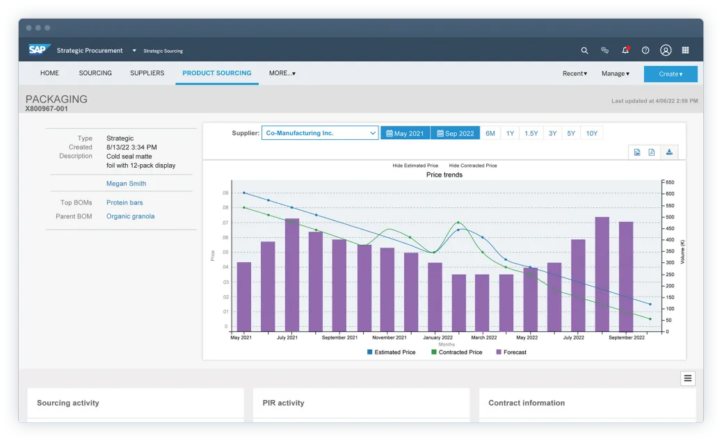 - 360-degree view of supply. Increase transparency with a 360-degree view of material price history and trends, sourcing activities, and sources of supply.
