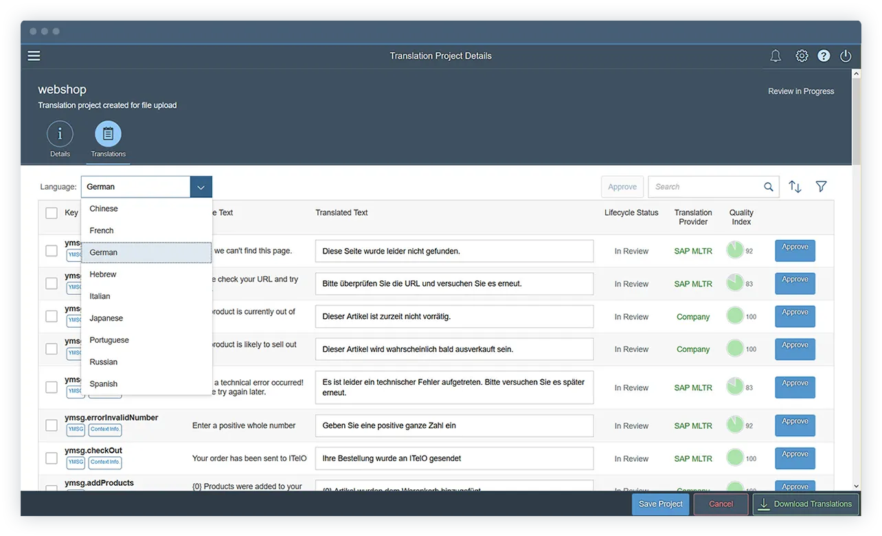 Benefit from easy and secure access for global collaboration: Get translations for texts from different repositories; check translations and filter by criteria like the translation provider or quality index; and collaboratively post-edit and review translations.