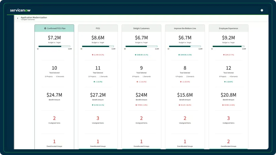 ServiceNow Scenario Planning is a strategic portfolio management tool enabling organizations to simulate and compare investment scenarios through what-if analysis, aligning portfolios with business objectives. It enhances decision-making by evaluating cost, benefits, and resource allocation across multiple scenarios.