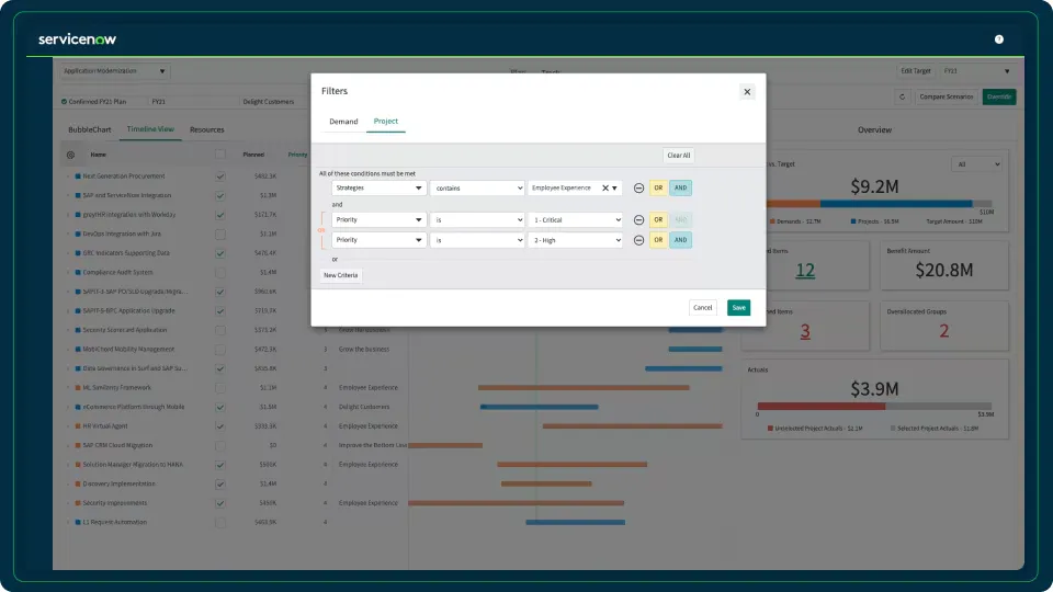 - Filter projects based on criteria like strategic alignment