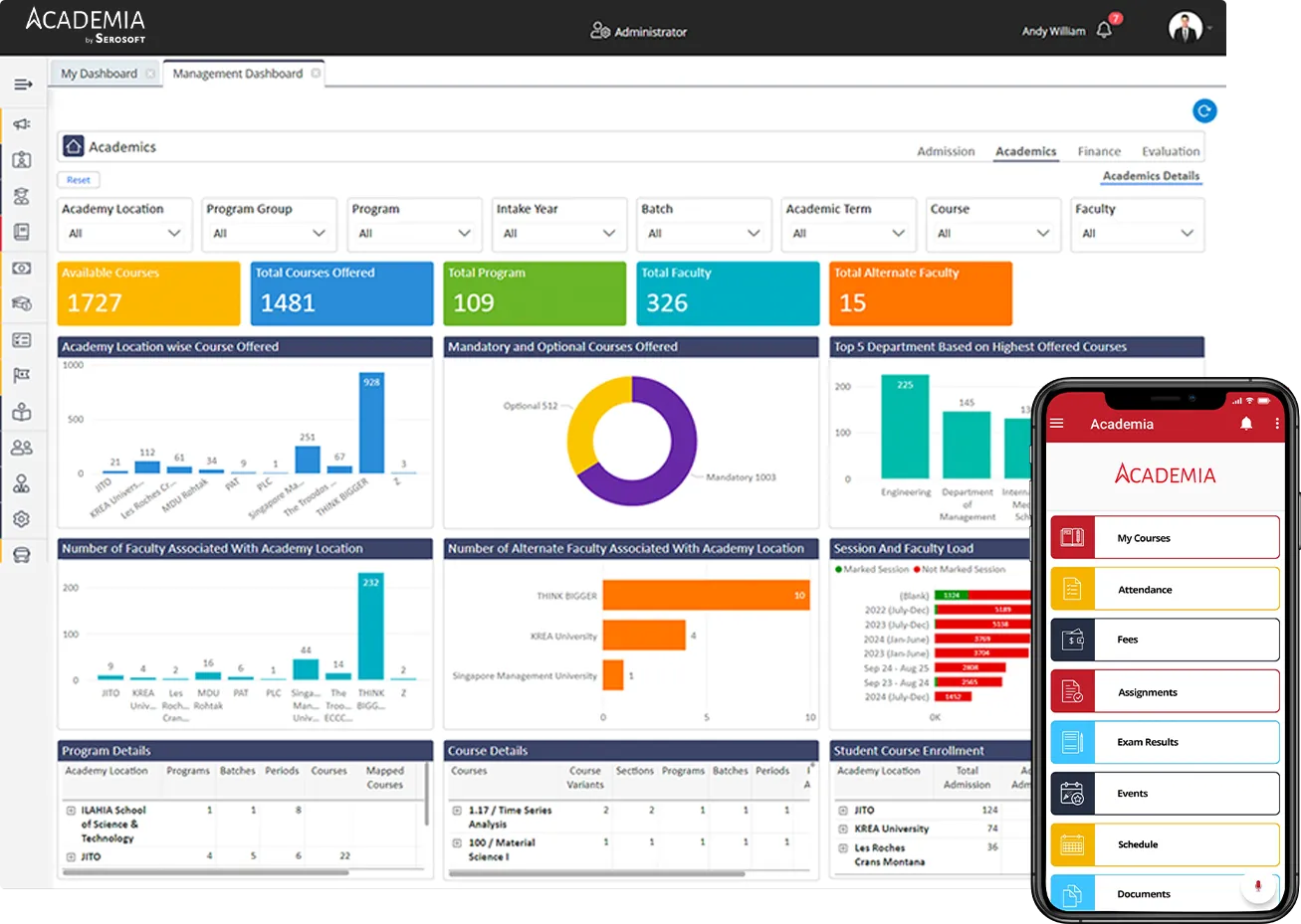 - Academic Management: Provides timetable creation, curriculum setup, class allocation, attendance tracking on multiple devices, and grade/marksheet generation with outcome-based education support.
