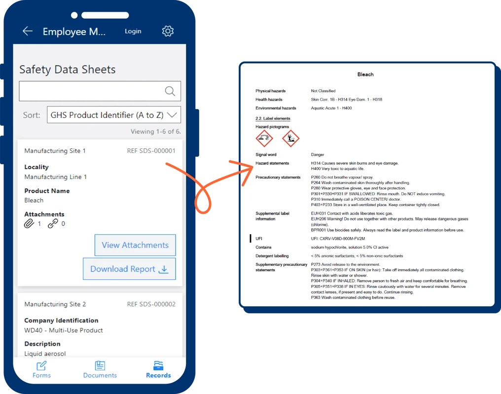 - Risk Assessment Integration: SDSs can be attached to hazard analyses, risk assessments, COSHH assessments, Job Hazard Analyses (JHAs), Process Hazard Analyses (PHAs) etc., to streamline safety workflows.
