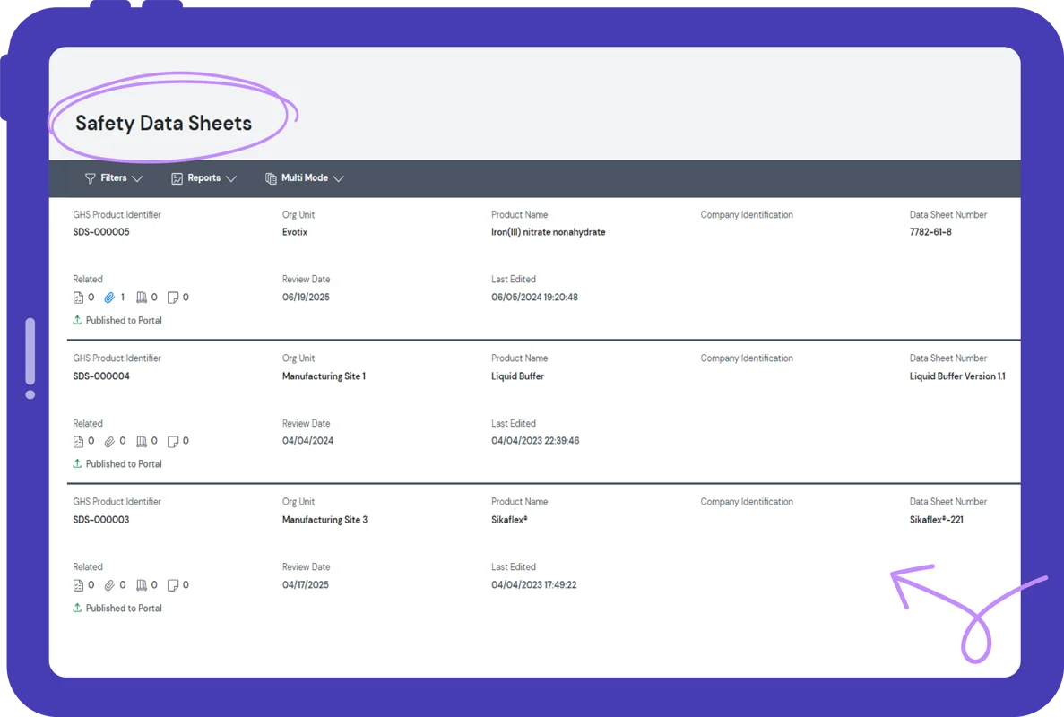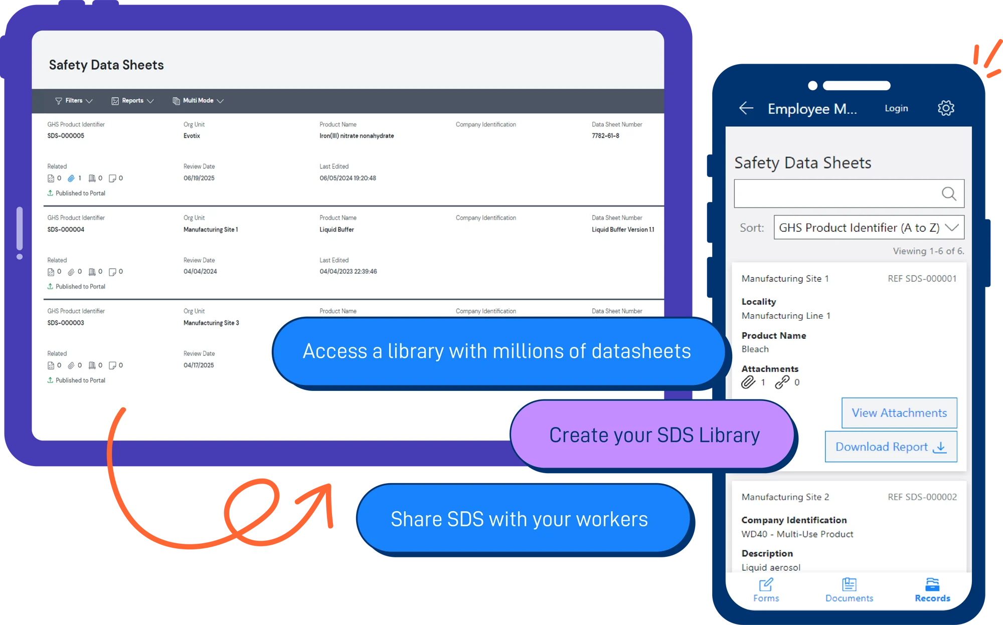 - Centralised & Accessible Dashboard: Manage, track and share SDSs digitally in a central dashboard — accessible via desktop or mobile device — facilitating transparency across sites and teams.
